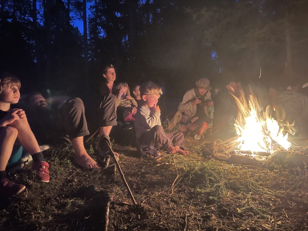2. Eld- & mörkeräventyret – Vi fortsätter resan med att lära oss om hur vi kan göra upp eld genom friktion, öva på att lyssna till naturens språk, öva på icke-verbal kommunikation, öva på att röra oss i mörker, lära oss om att läsa och förstå oss på vädret samt lära oss om och öva på att berätta berättelser.